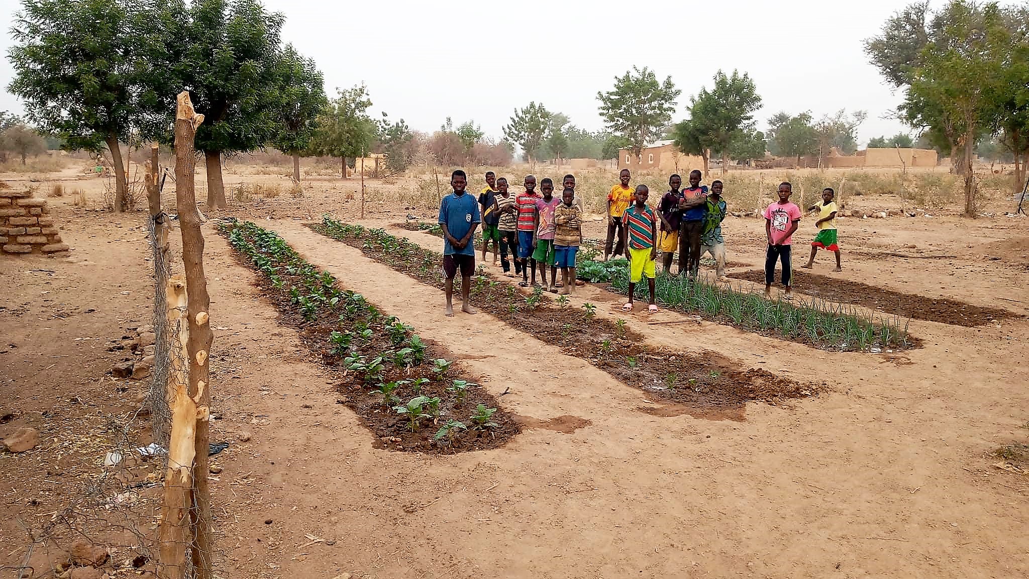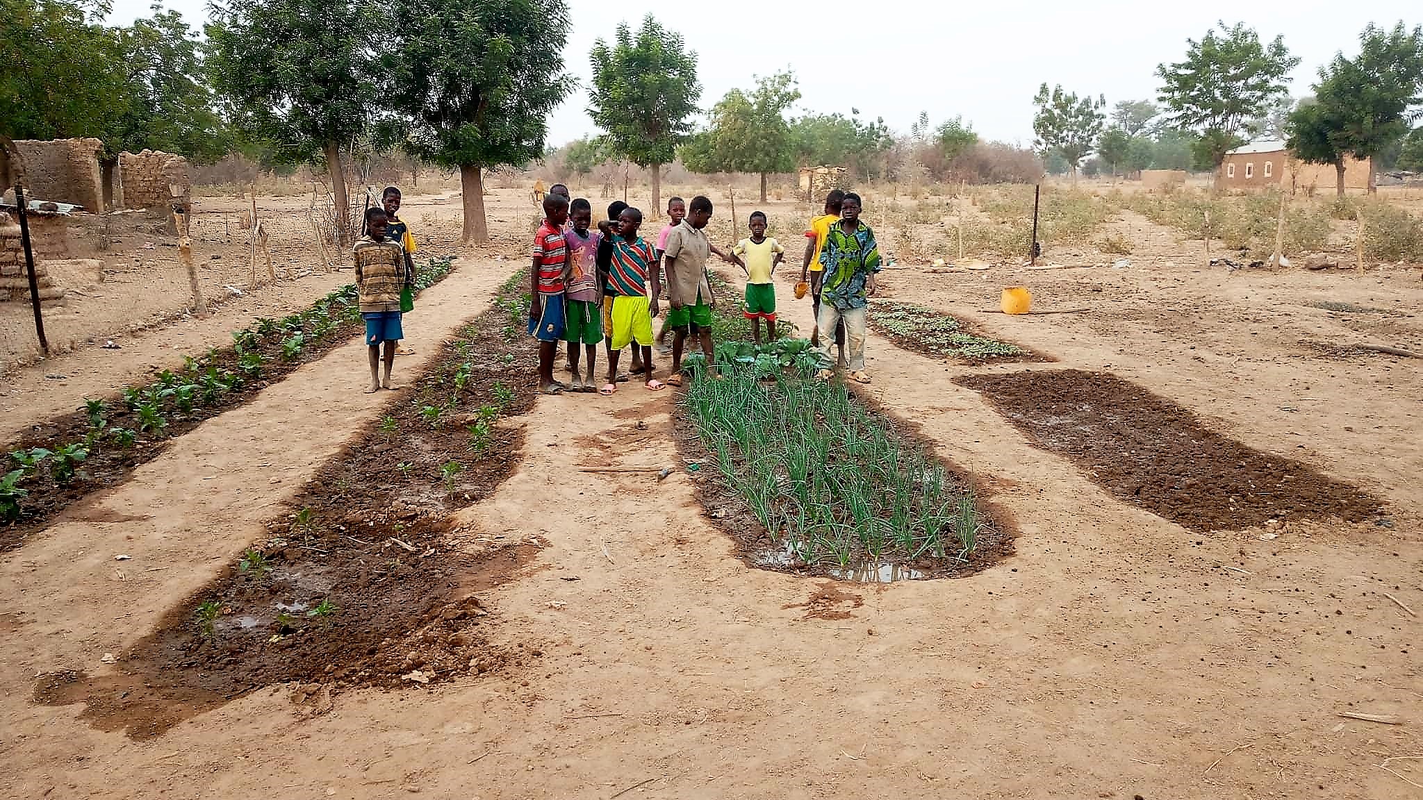 L’eau arrive par un tuyau relié au puits qui n’est pas très loin. Les enfants se servent d’arrosoirs pour assurer l’irrigation de ce jardin.